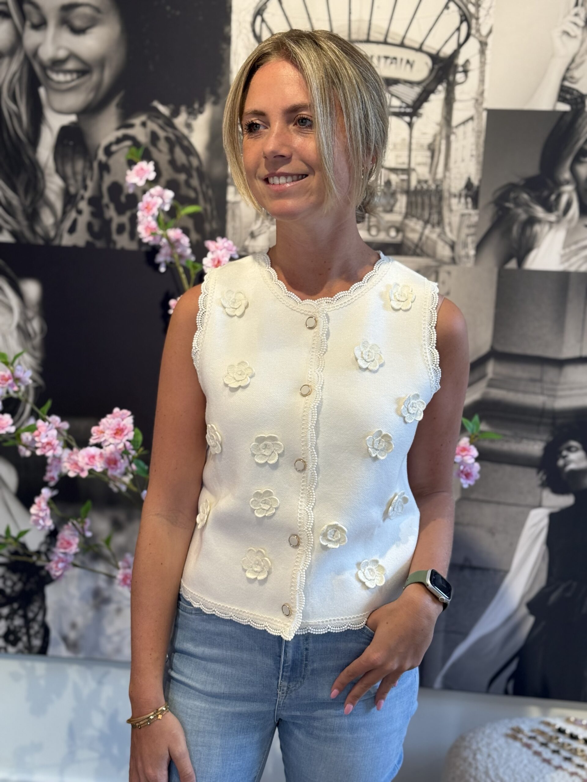 Deze top/gilet van Morgan is een verfijnd en vrouwelijk item met een romantische uitstraling. De gouden knoopjes geven het ontwerp een luxe touch, terwijl de kantdetails en subtiele bloemetjes zorgen voor een elegante en sierlijke afwerking.