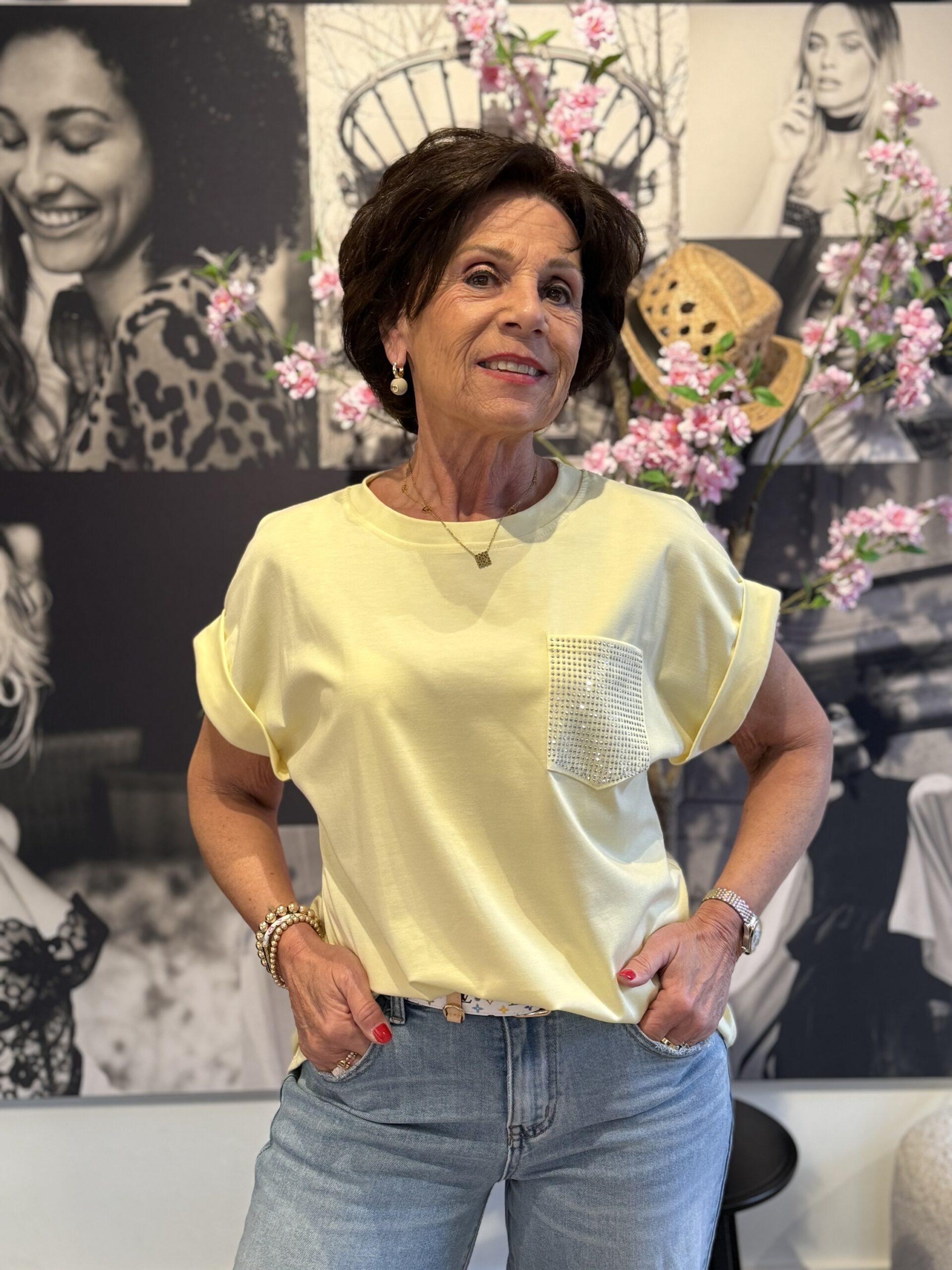 Dit stijlvolle T-shirt is een echte must-have voor jouw garderobe. Het subtiele glitterdetail op het zakje geeft een speelse en vrouwelijke touch. Dankzij de comfortabele one-size pasvorm is het shirt geschikt tot maat L/XL en perfect te combineren voor een casual of geklede look.