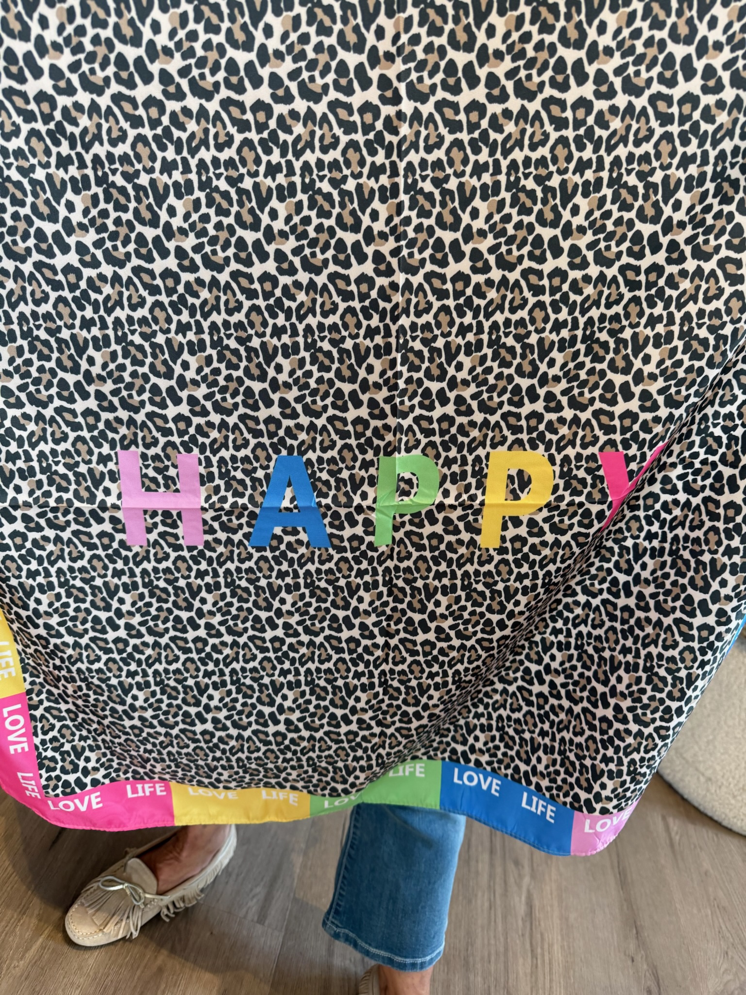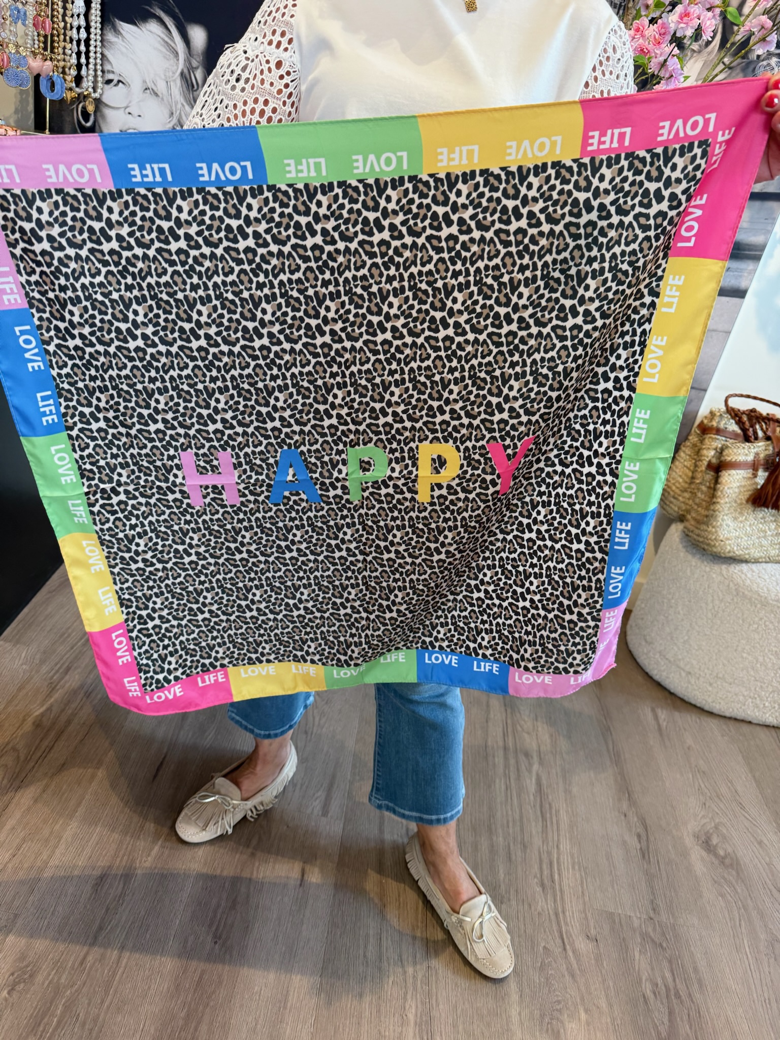 Dit sjaaltje met kleuren geeft je outfit een frisse en speelse uitstraling. Perfect om eenvoudig te combineren en je look net dat beetje extra te geven. ✨